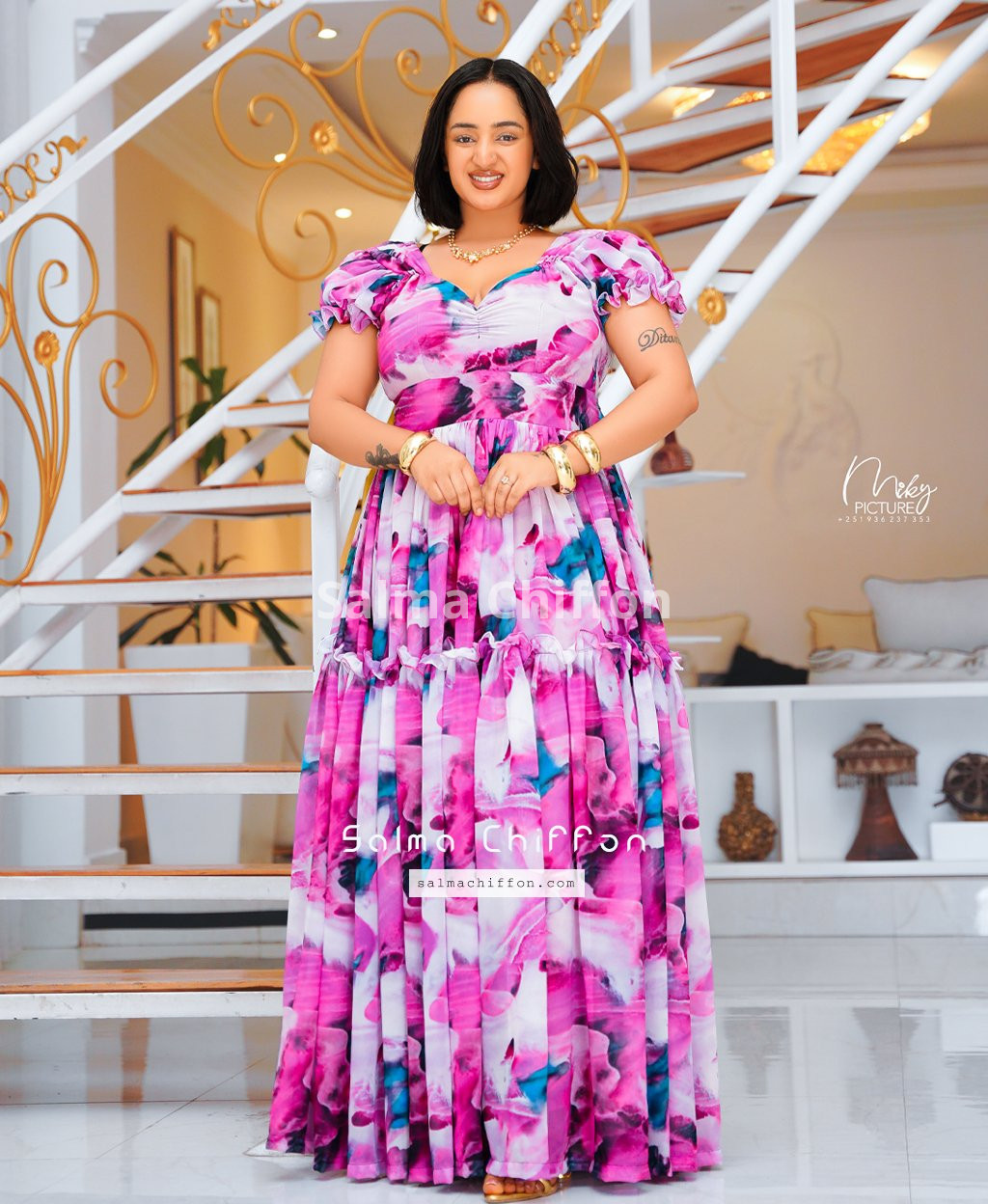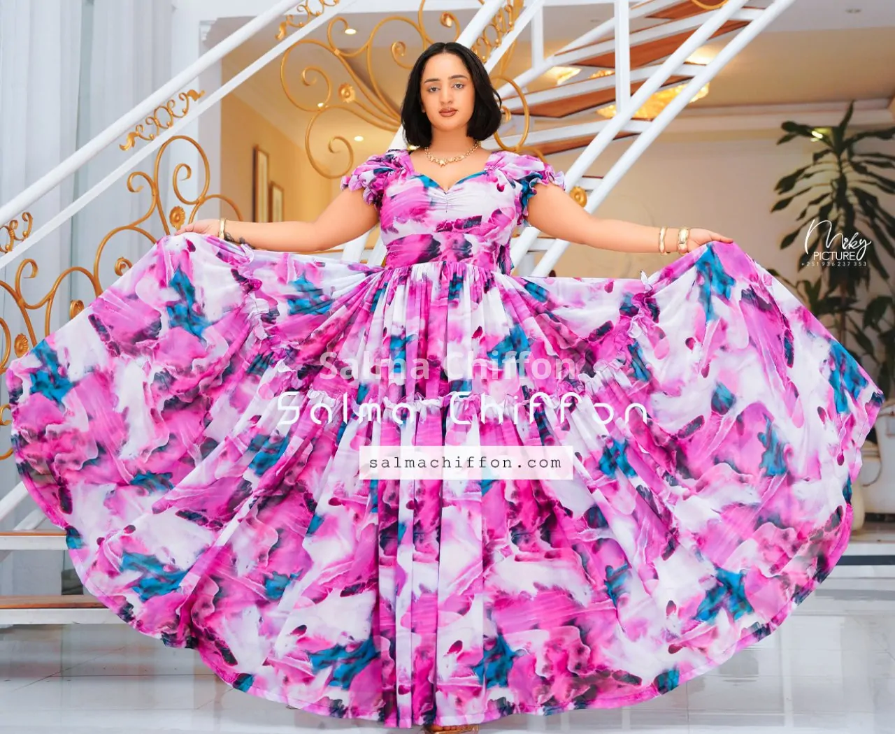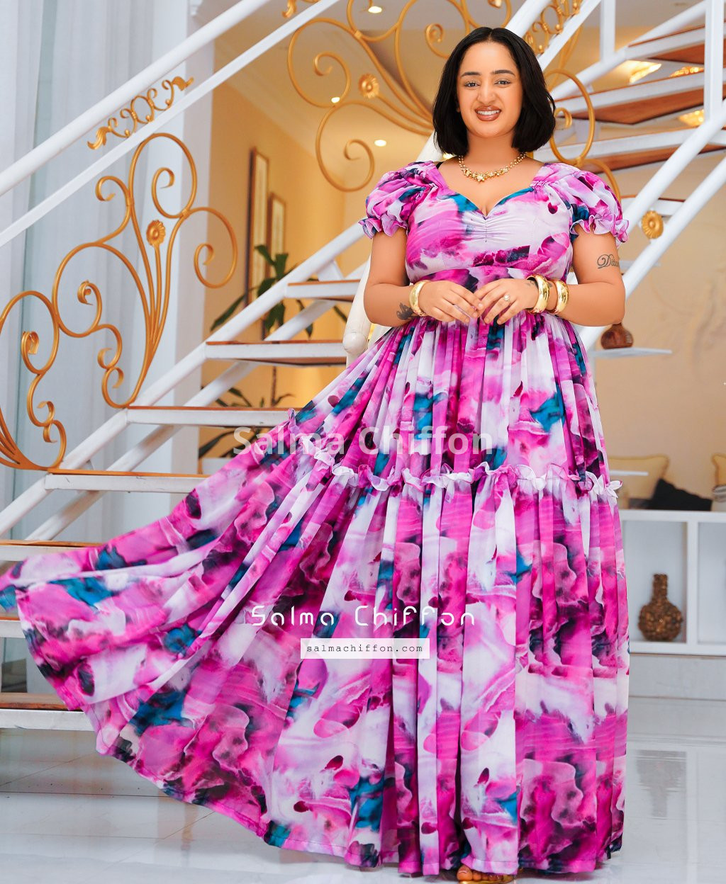The dress is made from high-quality chiffon. It’s light, breathable, and offers beautiful movement, especially for dancing and photography.