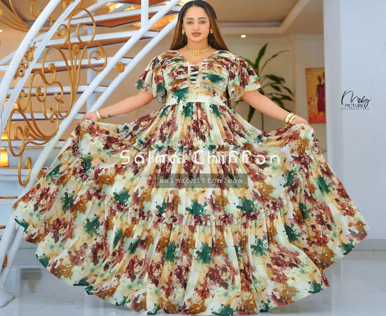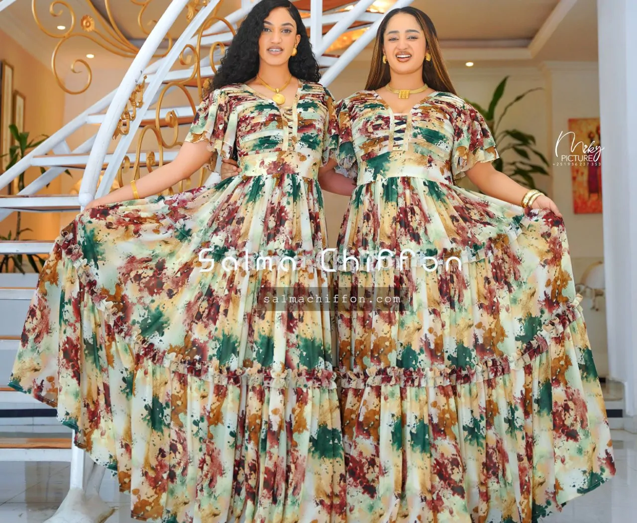 The Chiffon Kemis combines tradition with sophistication. Crafted from lightweight, breathable chiffon fabric, it drapes effortlessly across the body, offering both comfort and elegance. The signature patterns, often hand-woven or embroidered using tibeb designs, reflect centuries-old artistry from the Horn of Africa.